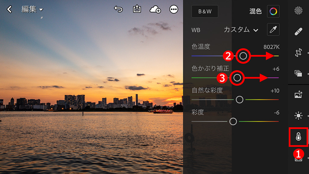 ①「カラー」ボタンをタップして、②「色温度」スライダーを右に移動。これで全体がオレンジ色に偏って、焼けた空の雰囲気が強くなります。