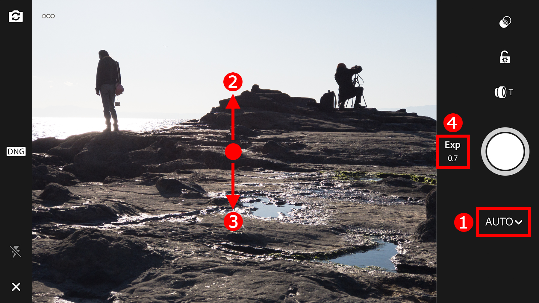 ①モバイル版Lightroomのカメラ機能を「Auto」モードにセットして、②やわらかに写すなら指を上にスライドして明るく、③劇的に写すなら下にスライドして暗くなるように調整します。スマホを縦に構えた場合は、右で明るく、左で暗く写せます。このテクニックを「露出補正」と呼びます。