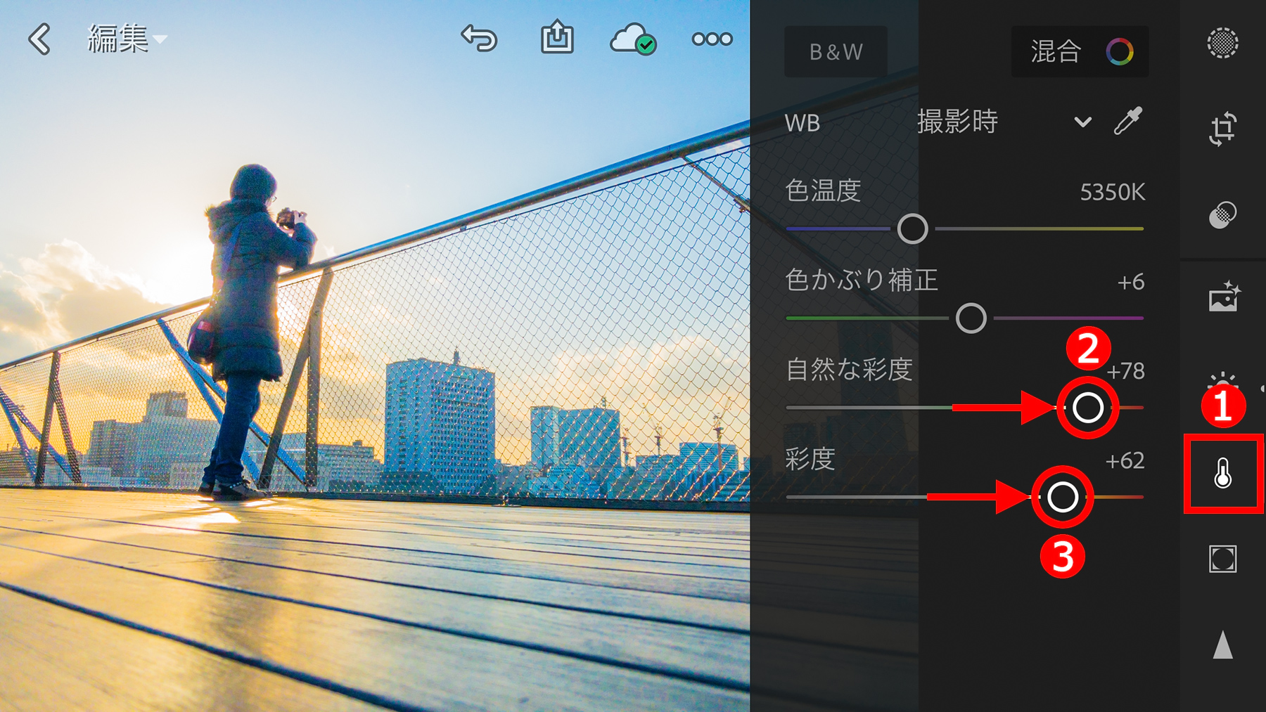 ①「カラー」ボタンをタップして機能を表示したら、②「自然な彩度」と③「彩度」スライダーを右に移動して補正します。写真の色を見ながら、好みに合わせて2つのスライダーを調合すればOKです。
