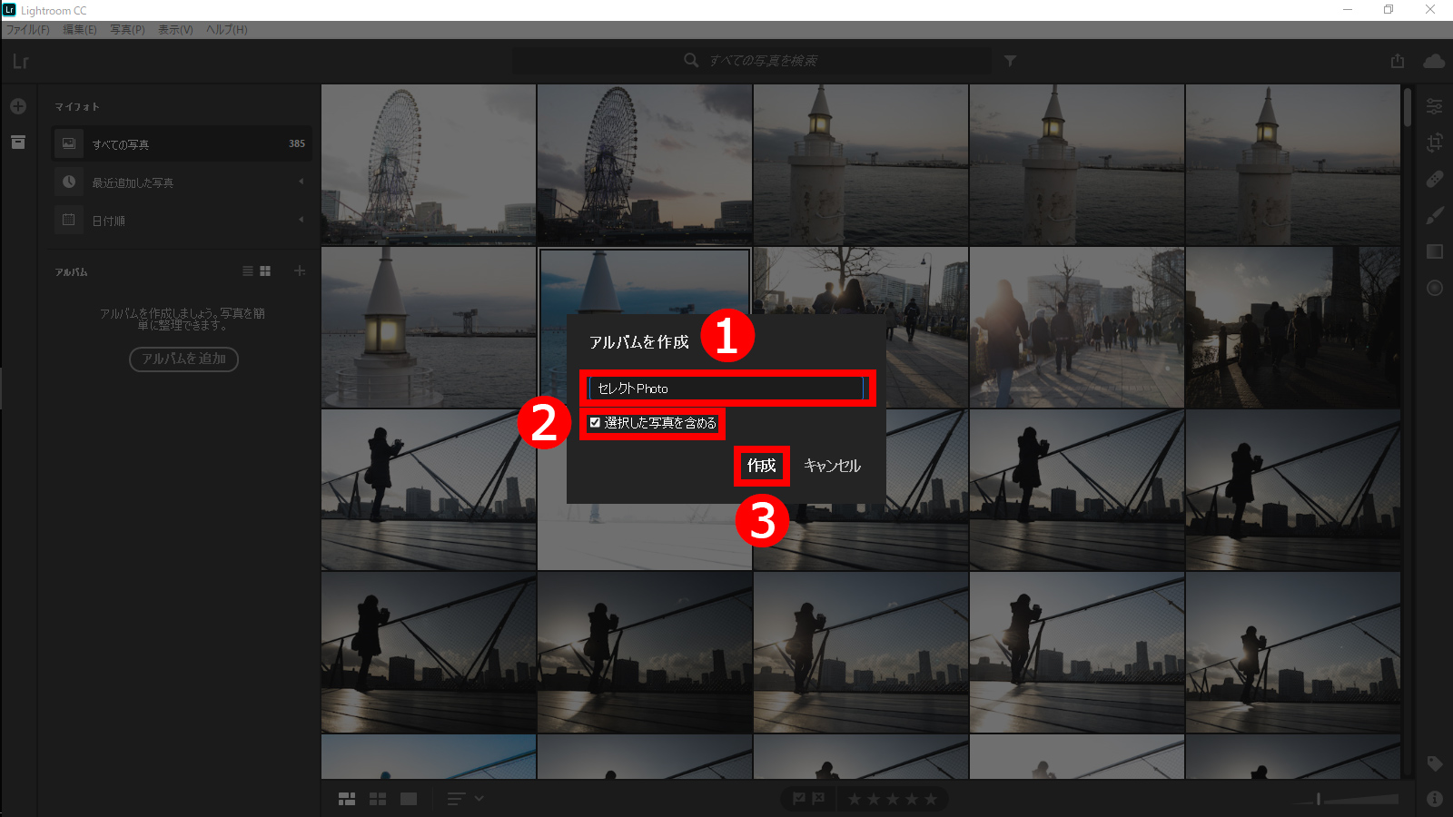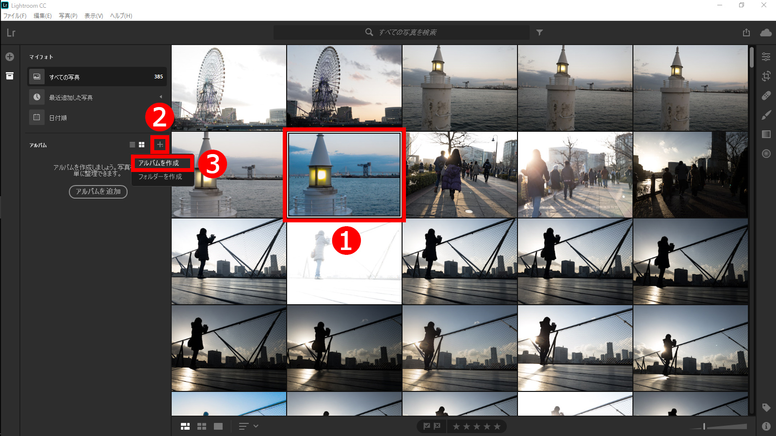 写真を選んだら、②「アルバム」パネルの右にある「+」ボタンをクリックして、③「アルバムを作成」を選びます。