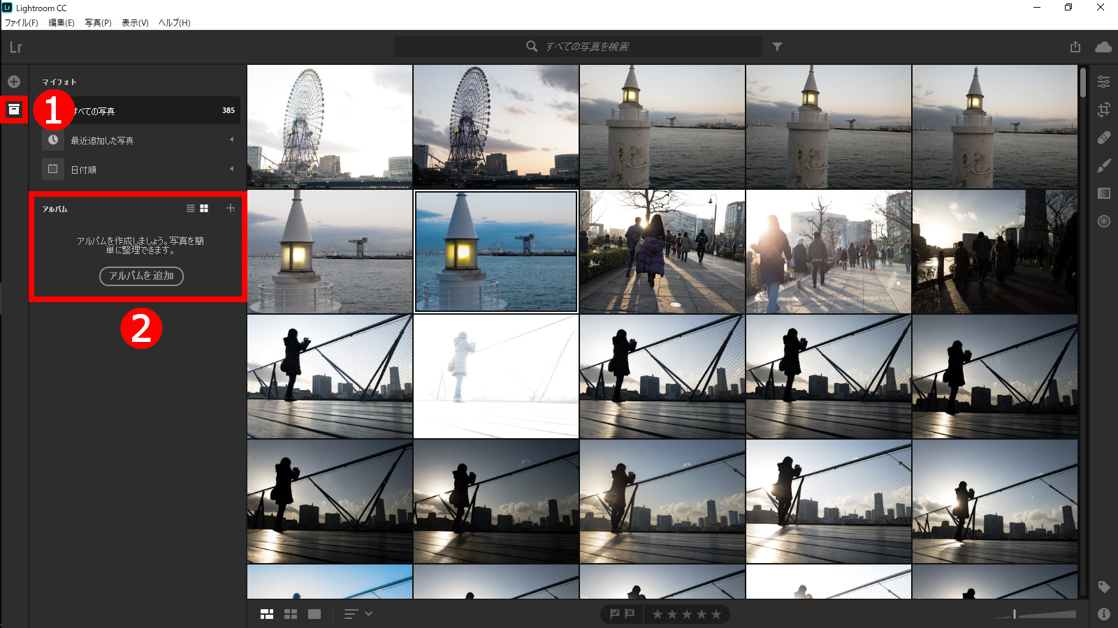 まずは、①画面左上にある「マイフォト」ボタンをクリックして、②「アルバム」機能にアクセスできるようします。