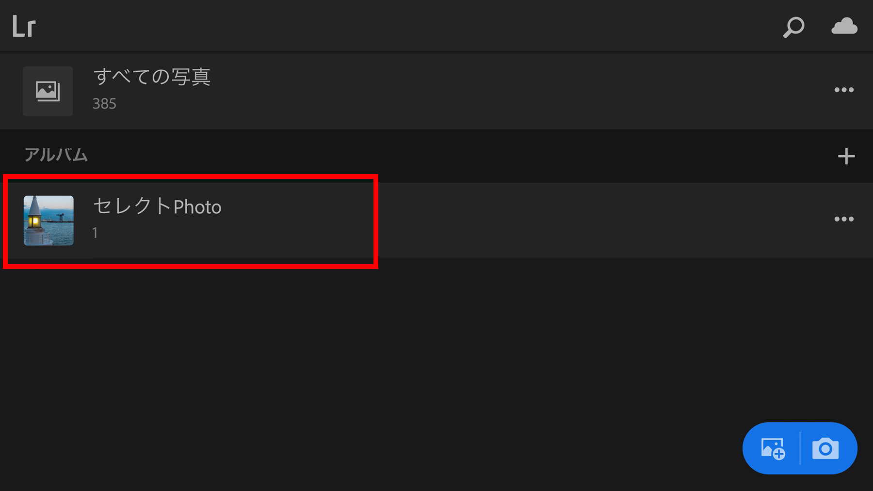 Lightroomはクラウドを経由してパソコン版とモバイル版が同期しているので、パソコン版Lightroomで作成したアルバムはモバイル版でも見ることができます。もちろん、その逆も同様です。