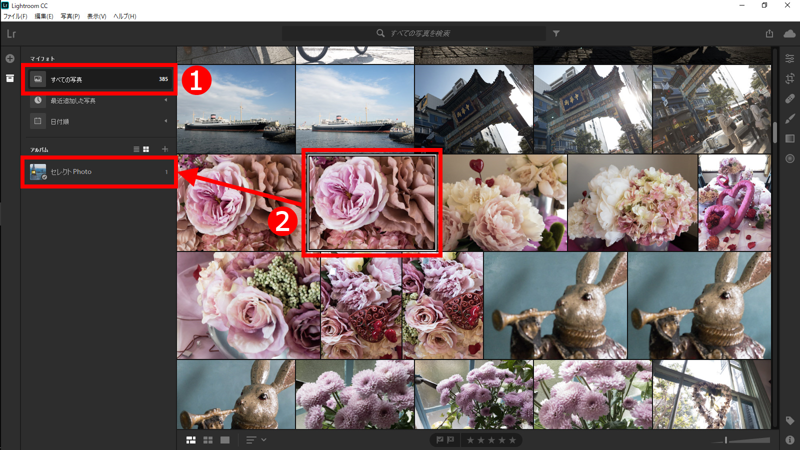 作ったアルバムに写真を追加したいときは、②必要な写真をアルバム名にドラッグ&ドロップすればOKです。