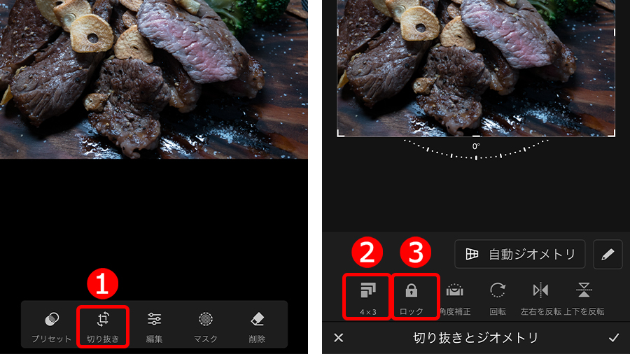 ①「切り抜き」ボタンをタップして、②縦横比のボタンから切り抜きたい比率を選択します。作例は「元画像」(4:3)を選びました。