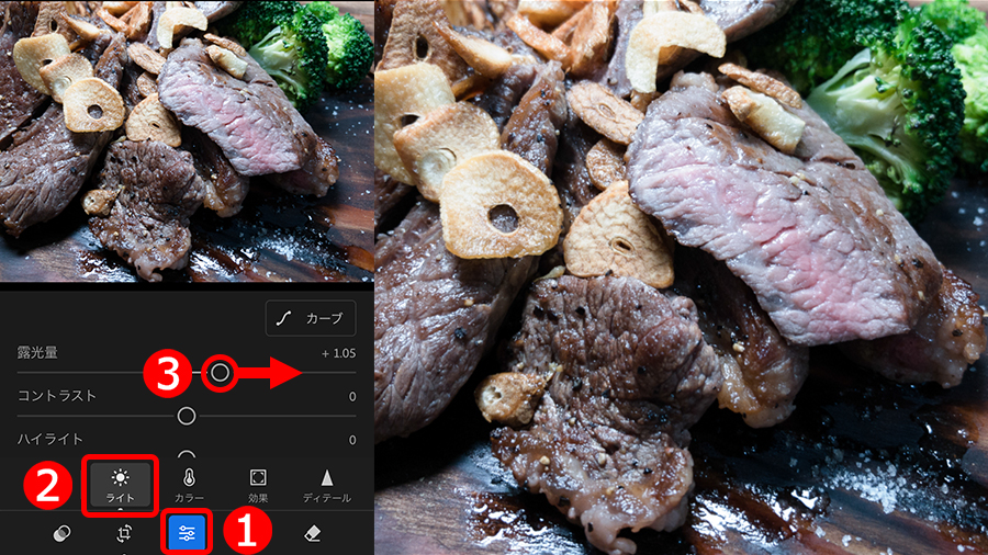 ①「編集」ボタンをタップして、②「ライト」ボタンをタップ、③「露光量」を右に移動して全体を明るく補正します。