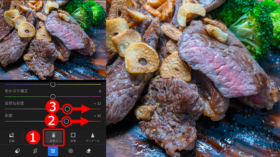 ①「カラー」ボタンをタップして、②「彩度」、③「自然な彩度」の順に調整して、発色のよい色彩に補正します。