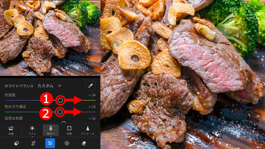 作例の場合は、どちらも右方向に移動して赤紫を強めることでお肉の表面を焦がしました。