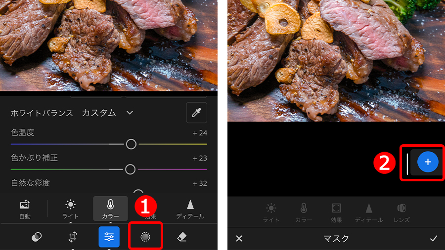 ①「マスク」ボタンをタップして、②「+」ボタンをタップし、マスクの一覧を表示します。