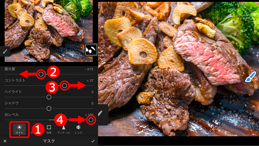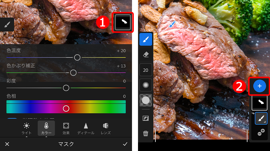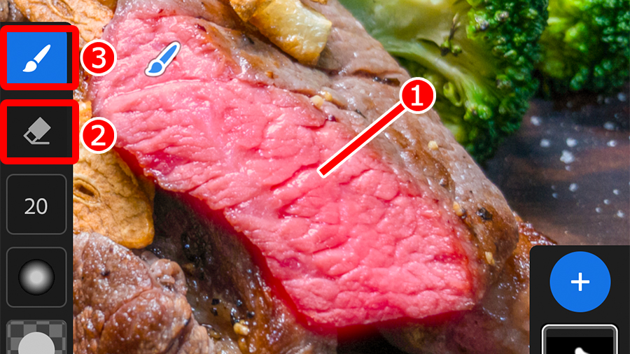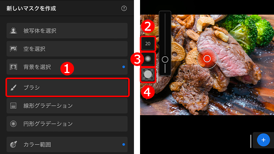 ①「ブラシ」をタップして選択し、②ブラシの形状やボケ足を設定、③補正したいお肉の表面をスワイプして赤く塗りつぶします。