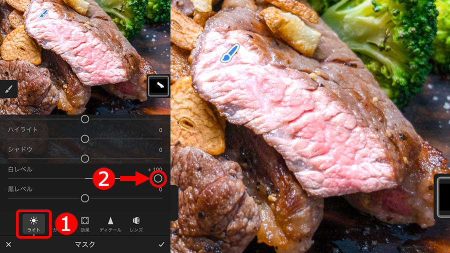 ①「ライト」ボタンをタップして、補正機能の下の方にある、②「白レベル」を右に移動。