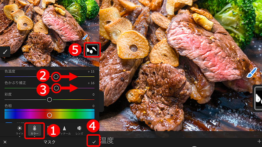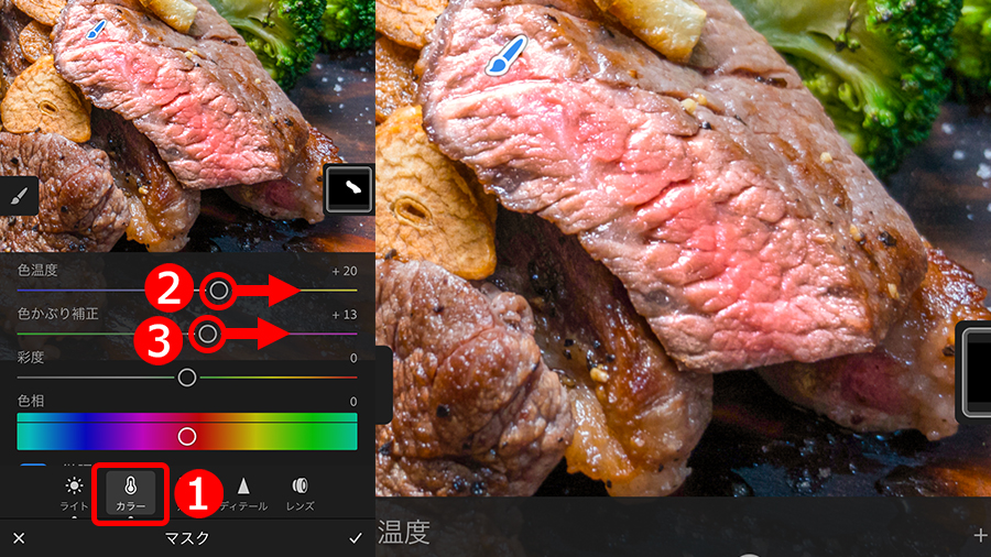 ①「カラー」ボタンをタップして、②「色温度」と、③「色かぶり補正」を使い、くすみのない暖かみのある色に補正しました。