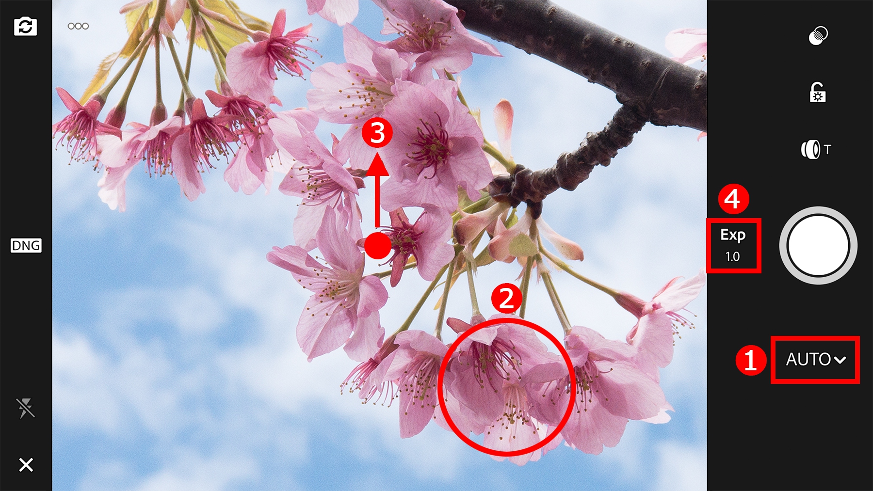 カメラ機能を起動したら、①カメラを「AUTO」モードにセット。②桜の花ををタップしピントを合わせます。