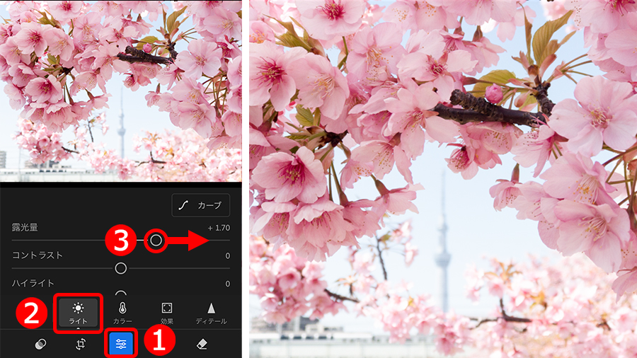 もし、桜の色がきれいに写せなくても大丈夫です。Lightroomの編集機能で理想の写真に仕上げられますから。