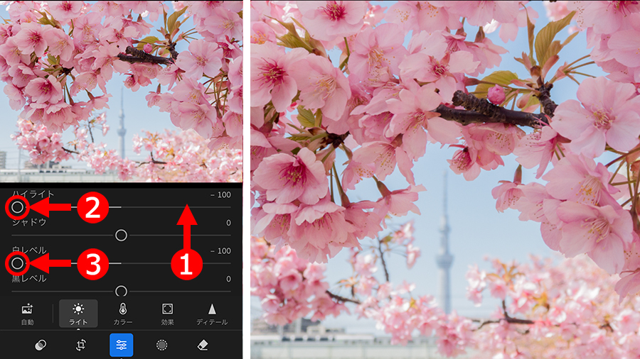 ①スライダー一覧の部分を上にスライドして、②「ハイライト」と、③「白レベル」を表示したら、どちらも左に移動して明るい部分が暗くなるように補正します。