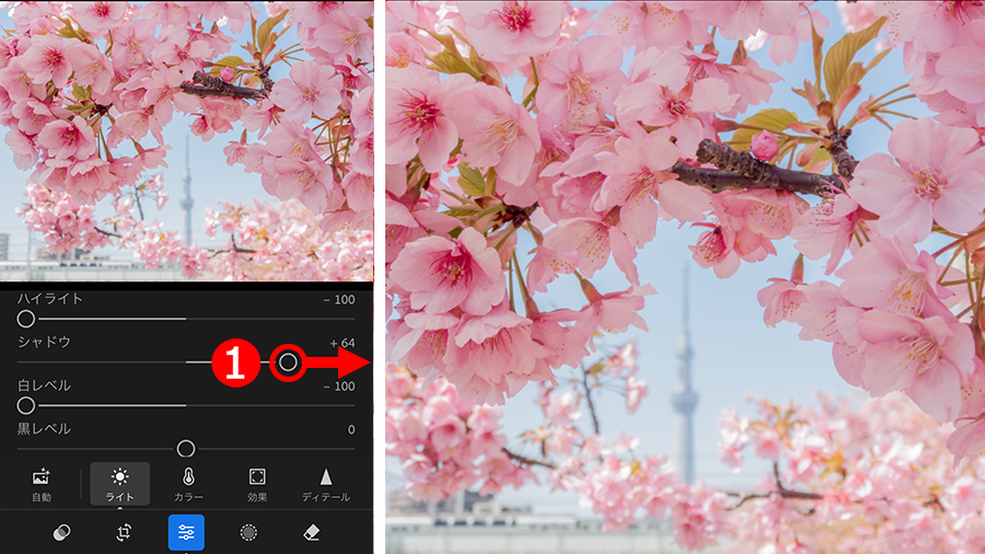 使う機能は、①「シャドウ」で、暗い部分が明るくなるようにスライダーを右に移動します。