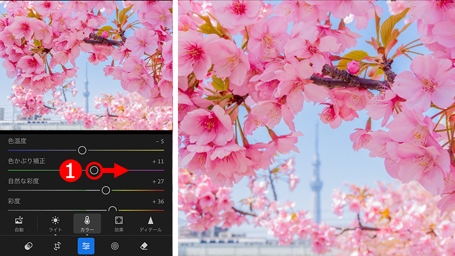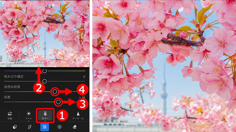 色が破綻しない範囲で鮮やかにできたら、④「自然な彩度」を右に移動して足りない鮮やかさを補いましょう。