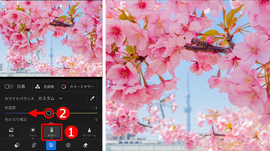 まずは全体の色味かあら補正します。使う機能は、①「カラー」ボタンにある、②「色温度」です。