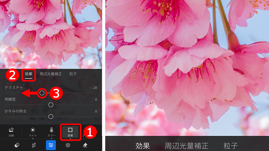 ③「テクスチャ」を左に移動して、シワや汚れなどの微細な模様をあいまいにします。