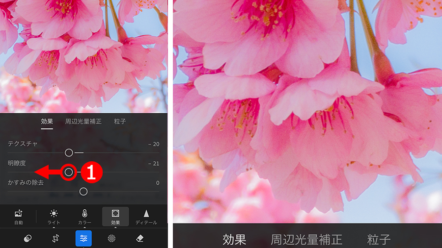 次に、①「明瞭度」を左に移動します。この調整を行うと輪郭があいまいになり、ソフトフォーカスのような描写にすることができます。