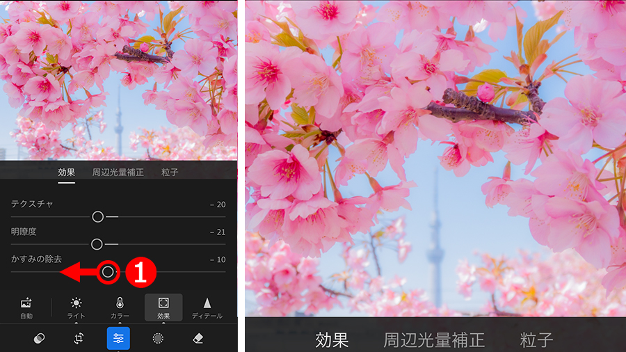 最後は、①「かすみの除去」を左に移動して淡くかすんだ描写に調整します。