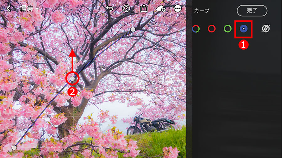 写真の上に「カーブ」機能が表示されたら、①「ブルーチャンネル」をタップして選択し、②右上がりの青い直線(「カーブ」機能)の中央を少し上に移動して青っぽく補正します。