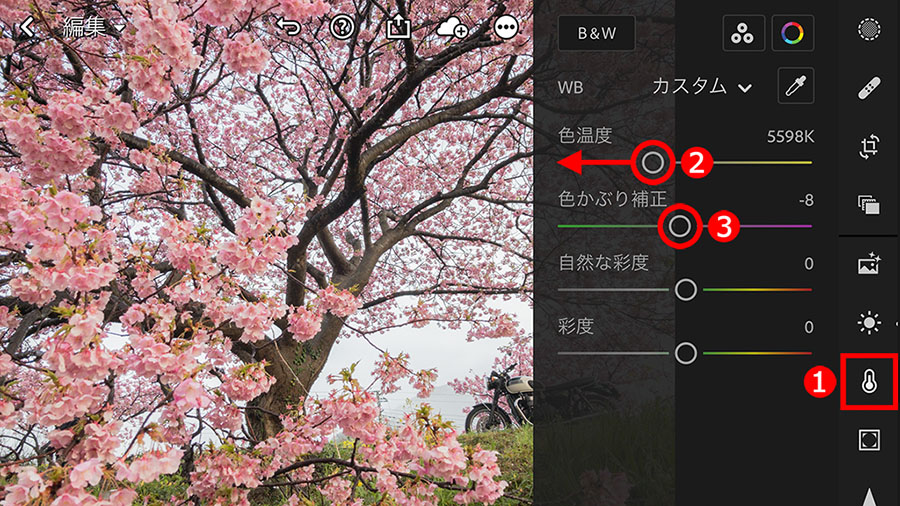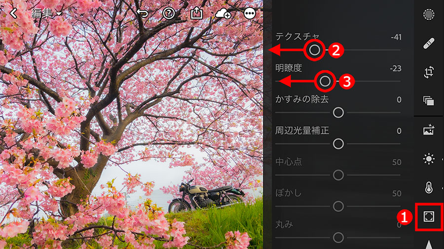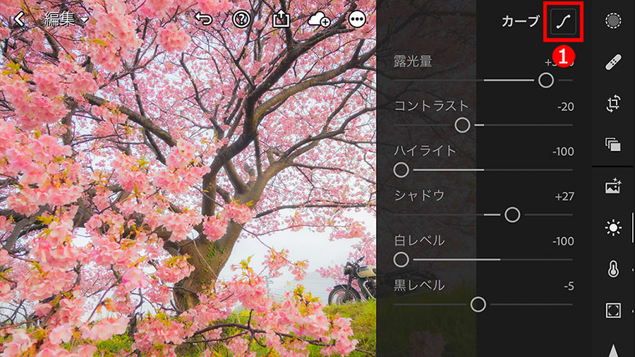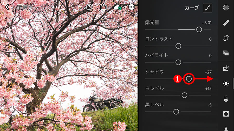 桜の花の陰になっている部分や、「プラスワン」の要素として写したオートバイの車体が色濃い色調だったので、暗い部分が明るくなる、①「シャドウ」スライダーを右に移動して、陰の濃さをやわらげました。
