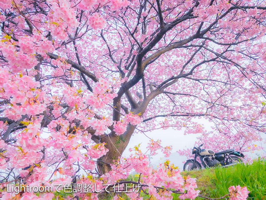 今回仕上げた写真も、薄曇りの日に撮影しました。「桜プラスワン」の撮り方を意識して、オートバイが画面の隅に入る構図で写しています。
