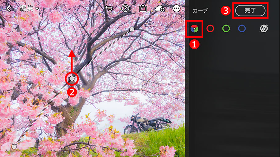 「カーブ」機能で「ブルーチャンネル」や「レッドチャンネル」などを調整したときは、①「RGBチャンネル」を選択して、②「カーブ」の中央を上下に移動して明暗を微調整し、きれいに見える明るさにしておきます。この写真の場合は、少しだけ上に移動して明るく微調整しました。