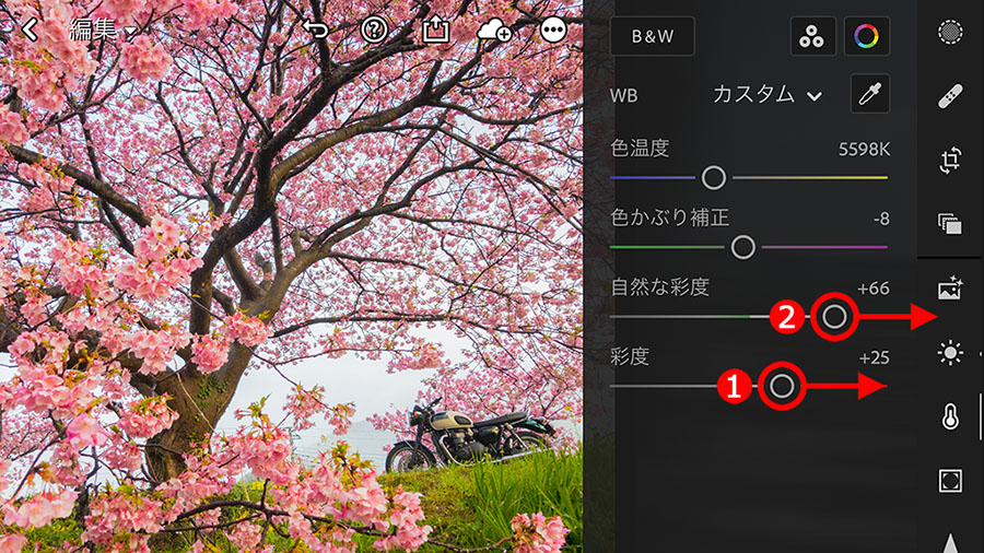 続いて、映えのある色彩に調整します。使う機能は、①「彩度」と、②「自然な彩度」スライダーです。