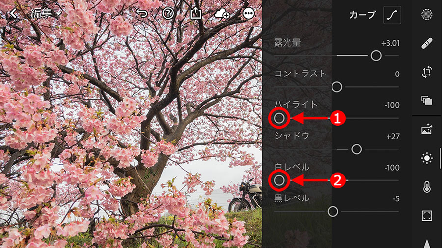 色は明るくなると薄く見える特性があるので、濃くするときは桜の色(=ハイライト部分)が暗くなるように調整すればOK。この作業は、①「ハイライト」スライダーを左方向に移動して実行します。