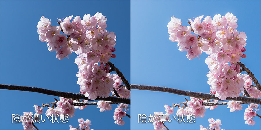 とくに、桜の花に直射日光が当たっている場合、光の当たる部分は色が抜けて白に近くなり(美しい桜色が失われる)、陰の部分は黒に近い濃さが生じてしまいます。いわゆる、「濁って見える」という状態です。
