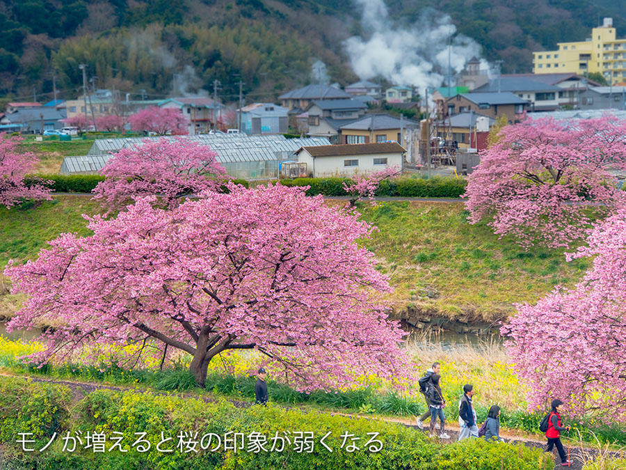 桜以外の要素が多くなっても写真としては成り立ちますし、よい写真はたくさんあります。でも、写っているものが増える(得られる情報が多い)ほど、「桜の写真」というよりは「状況写真」や「旅写真」的な印象が強くなってしまいます。