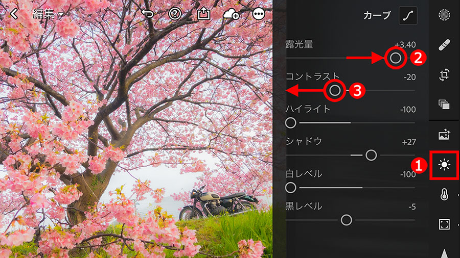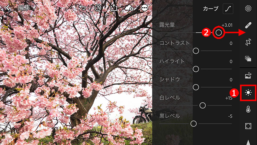明るくする調整は、①「ライト」ボタンをタップして、②「露光量」スライダーを右に移動することで実行できます。この段階は仮の調整なので、「普通に見える明るさ」にしておくと続きの作業がしやすくなります。