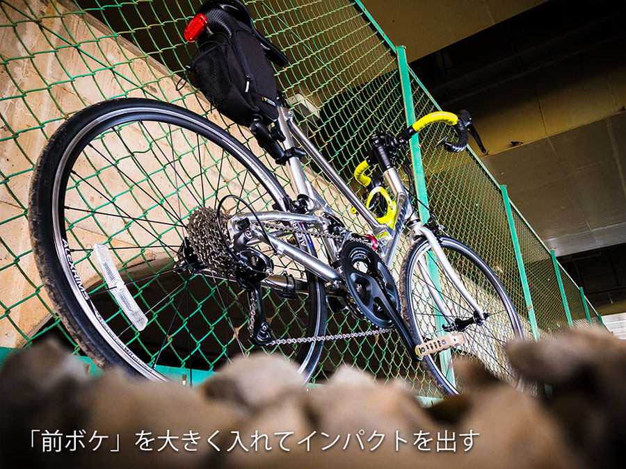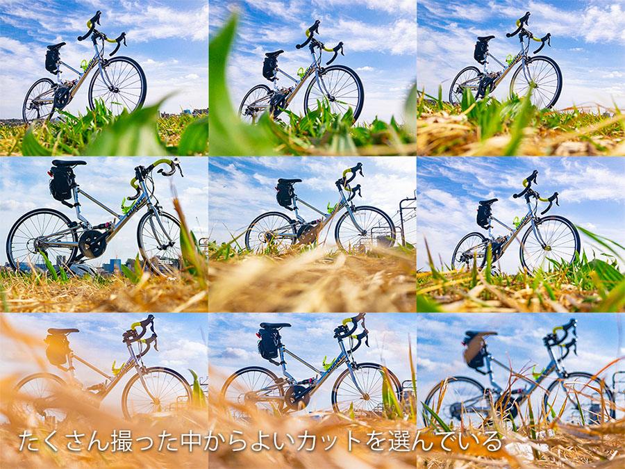 と流れるように紹介できるとスマートなのですが、現実はというと、「前ボケ」の素材やボケの強さ、主役(自転車)の位置などを試行錯誤しながら、何カットも撮影しています。