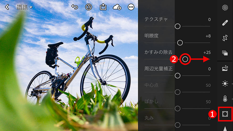 ①「効果」ボタンをタップして機能を表示したら、②「かすみの除去」スライダーを右に移動します。