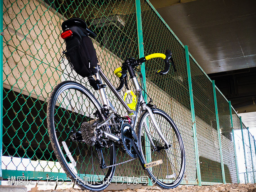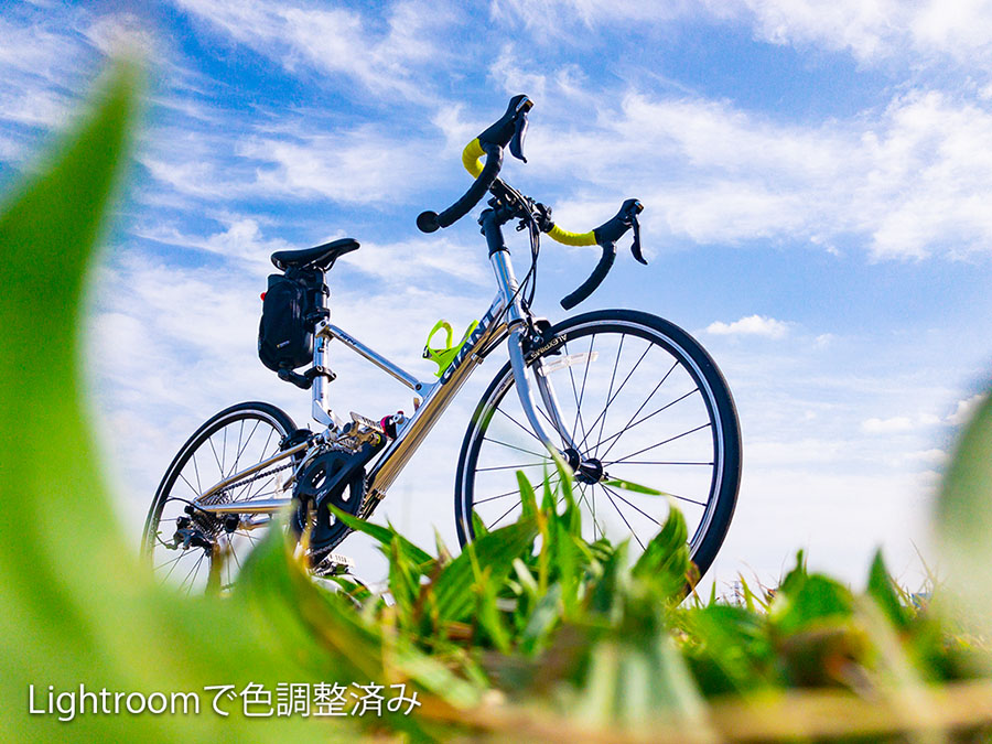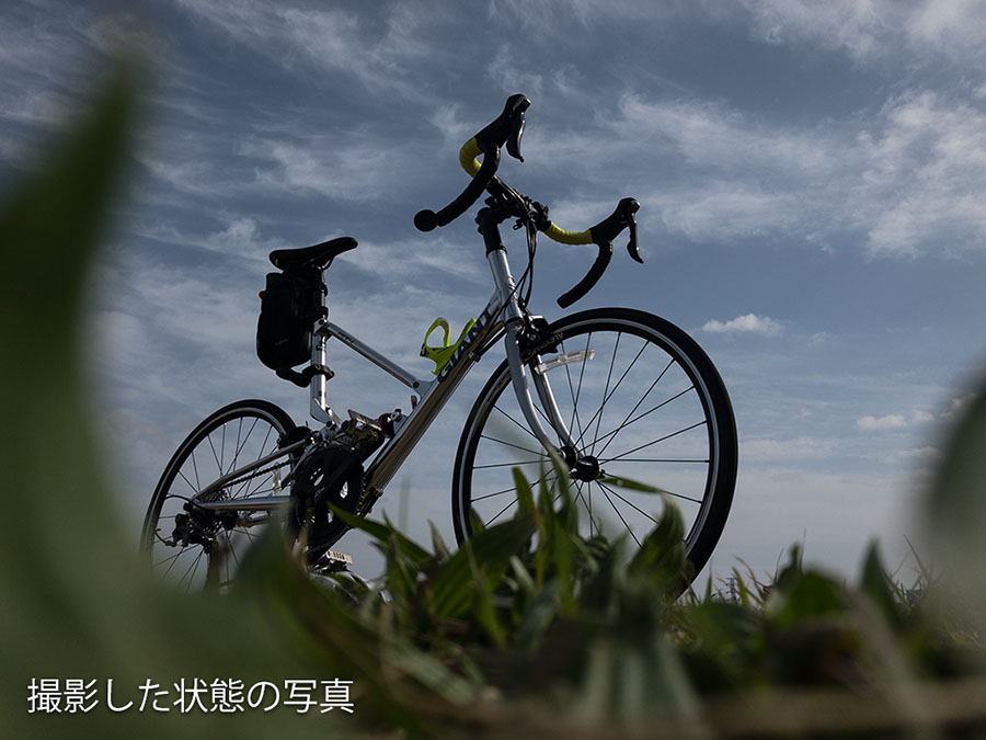 地面のところどころに雑草が生えていたので、この緑を手前に配置して、青空をバックに自転車を撮れば「きっと映えるだろう」と望みを託しました。