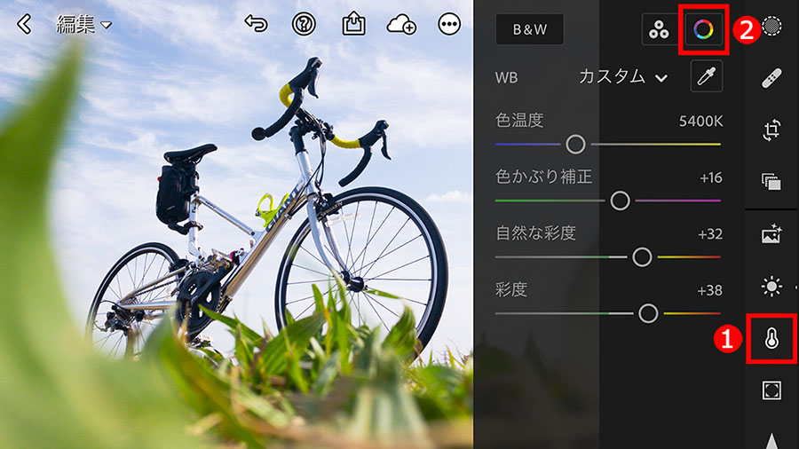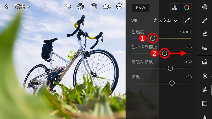 続けて、①「色温度」と、②「色かぶり補正」スライダーを使い、全体の色みを整えます。作業の流れとしては、「色温度」スライダーで「冷たい色/暖かい色」のバランスを整えるのですが、この写真は問題ないので調整しませんでした。