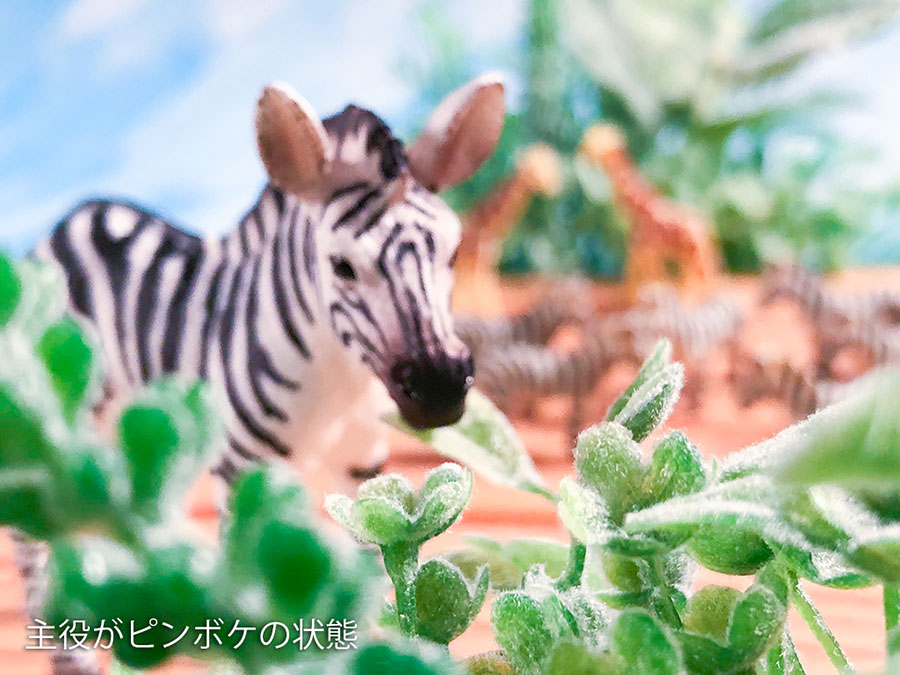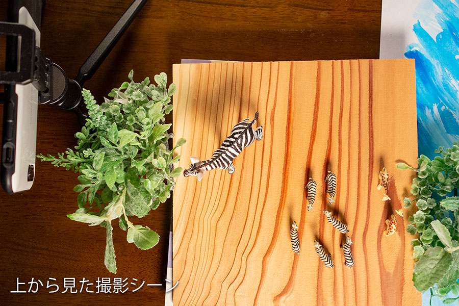 賑やかしに使っている背後の小さなシマウマやキリンも、100円くらいで買ってきたフィギュアです。