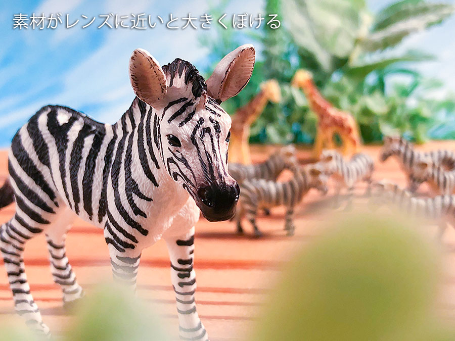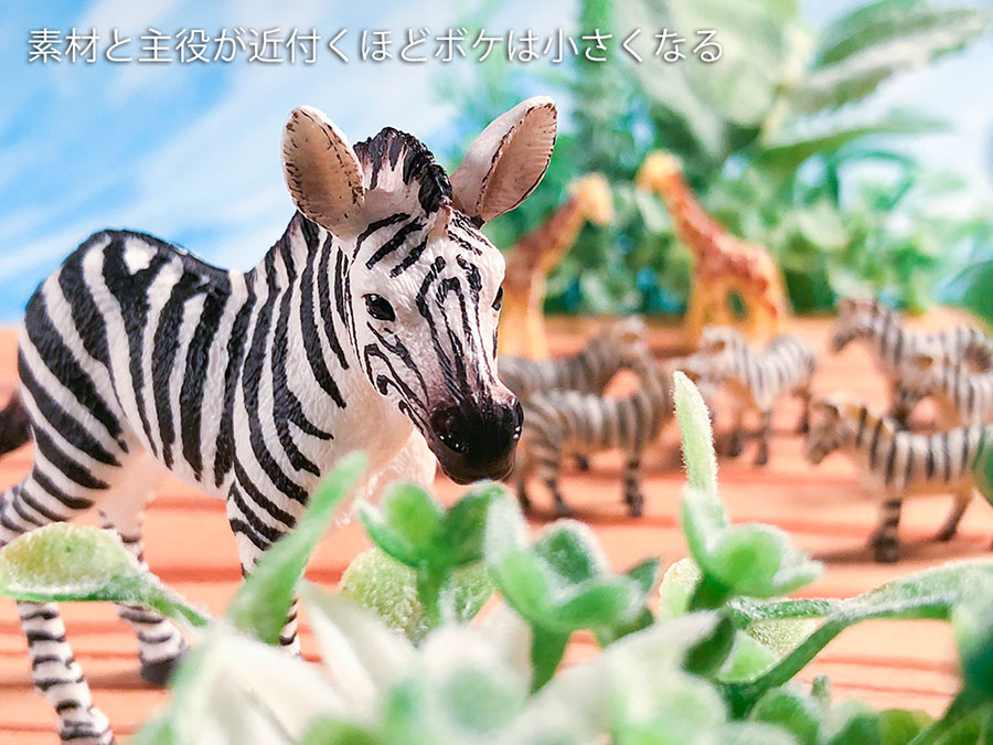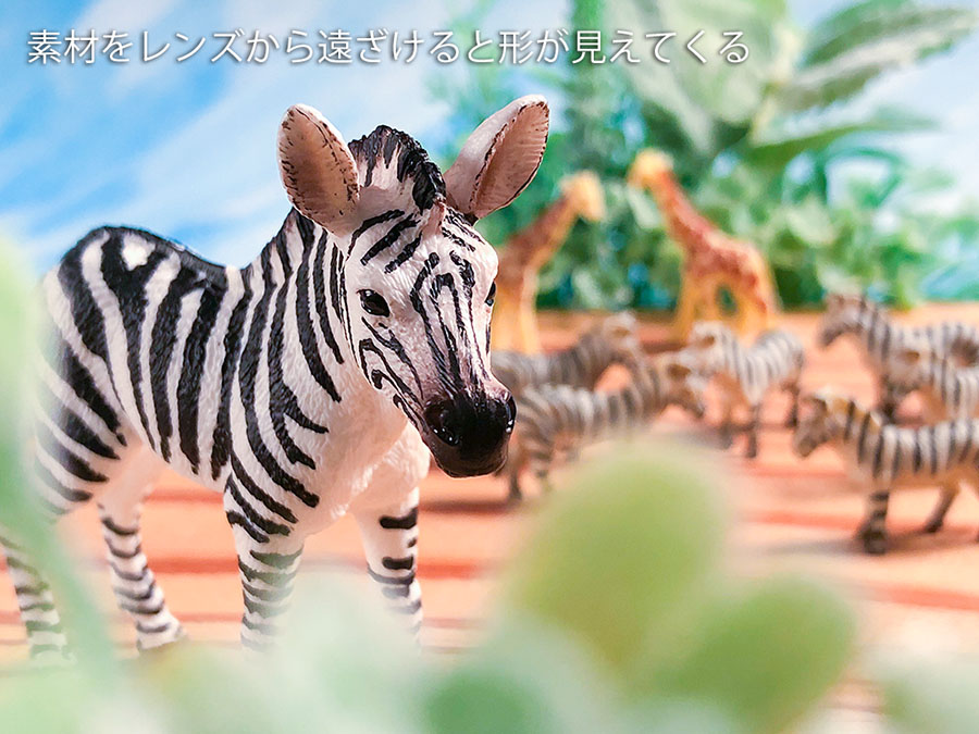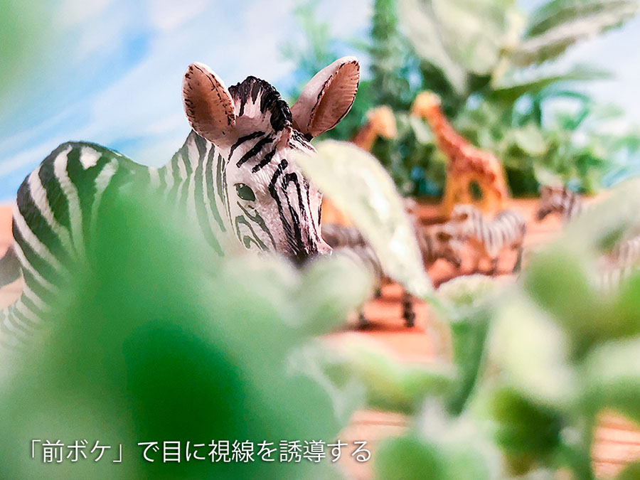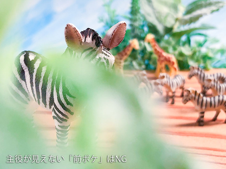 たとえば下の写真は、左に移っているシマウマが主役なのですが、「前ボケ」として用意した素材で見えない状態です。これは極端な例ですが、主役が「見づらい」と感じるような「前ボケ」は作らないようにしましょう。