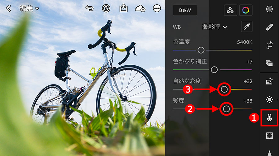 鮮やかさの補正に使う機能は、①「カラー」ボタンにある、②「彩度」と、③「自然な彩度」スライダーです。
