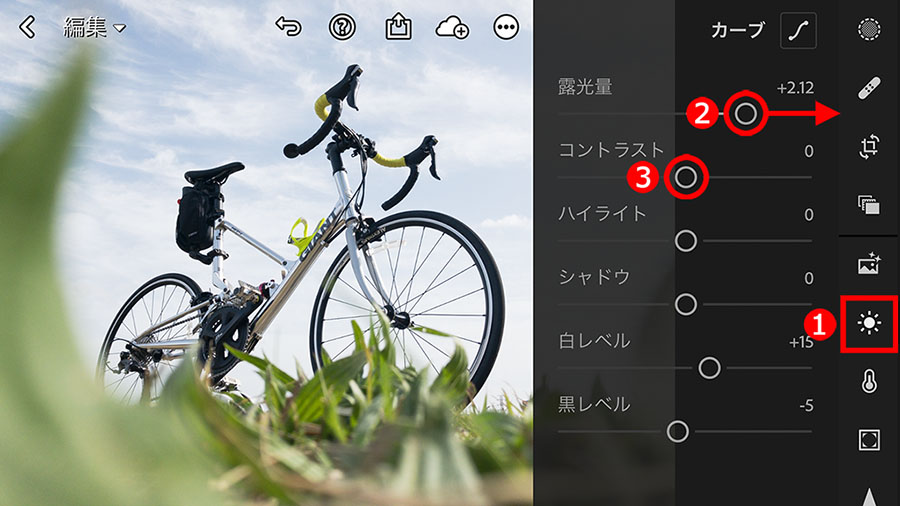 この写真は暗い写りなので、①「ライト」ボタンをタップして、②「露光量」スライダーを右に移動して明るく補正します。