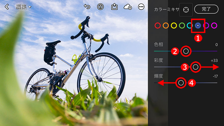 3つのスライダーは、②「色相」でブルーの色み、③「彩度」で鮮やかさ、④「輝度」で濃さが調整できます。