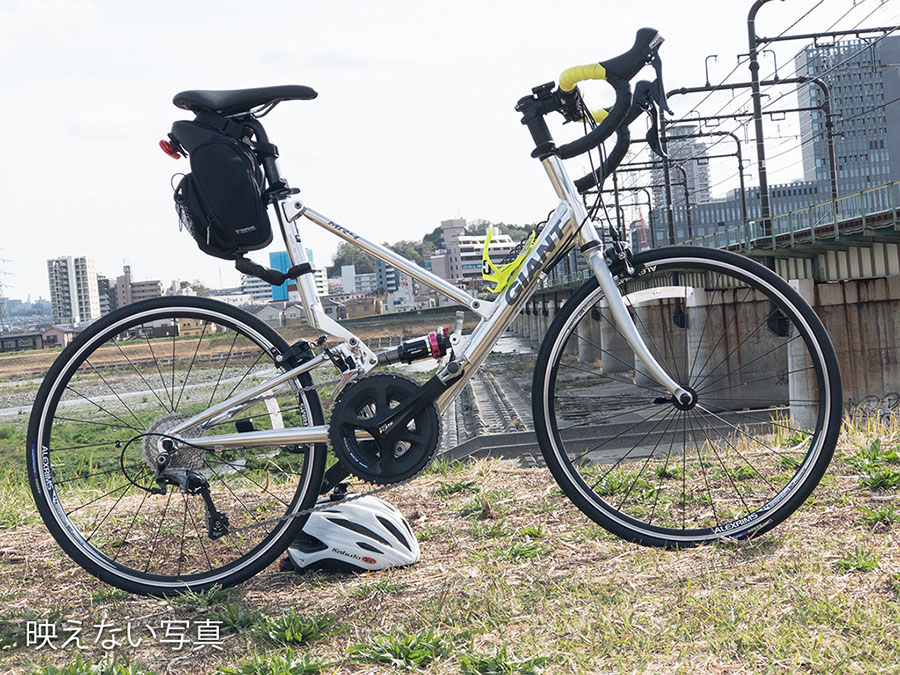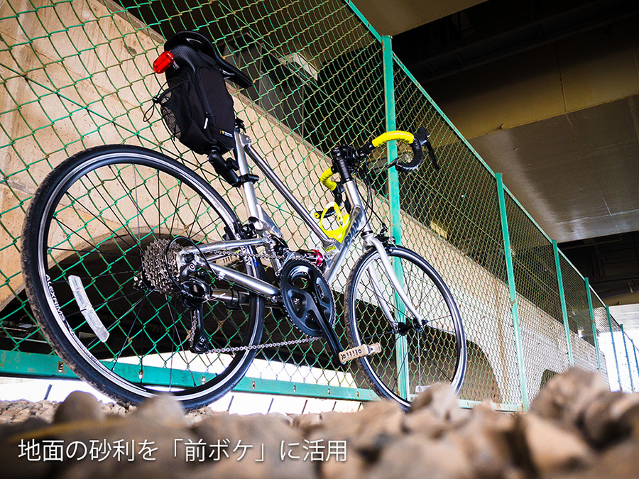 そこで、カメラの位置をもっと下げて、砂利越しに自転車が見えるように写した写真が下になります。