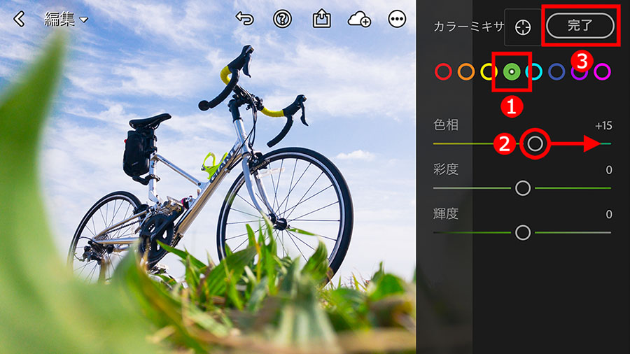 色別の調整が終わったら、③「完了」ボタンをタップして「カラーミキサー」画面を閉じます。