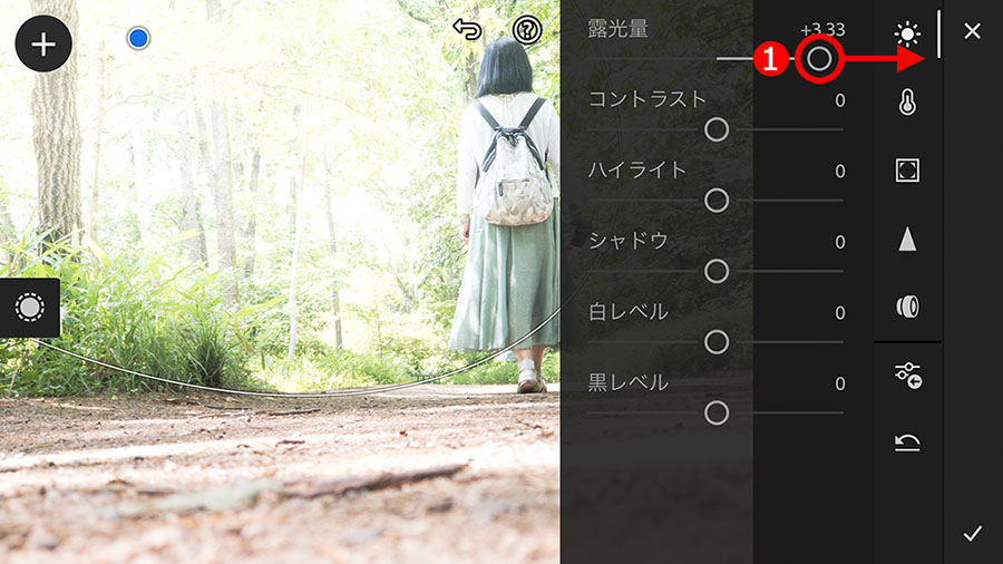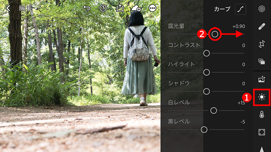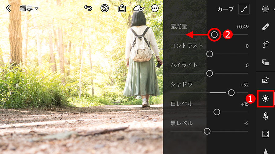明るくしたいので、①「露光量」スライダーを右に移動し、大胆に明るくします。