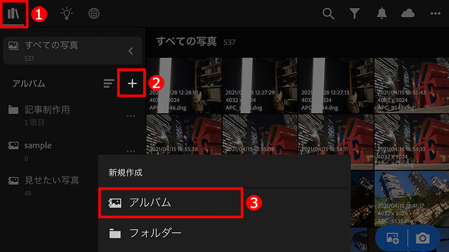 ①「ライブラリ」アイコンをタップしてメニューの一覧を表示したら、「アルバム」の文字の右にある、②「+」アイコンをタップし、③「アルバム」をタップします。