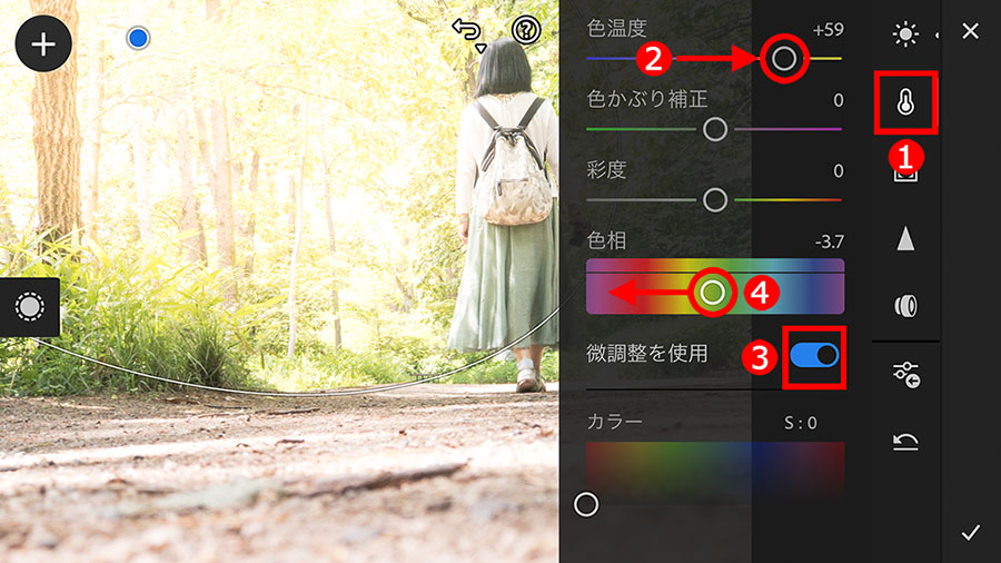少し暖かみのある光にしたいので、①「カラー」ボタンをタップして、②「色温度」スライダーを右に移動しました。さらに、光の色を微調整するために、②「微調整を使用」スイッチをタップしてオンにしてから、③「色相」の〇アイコンを左に動かして、わずかにオレンジ色に変化させます。