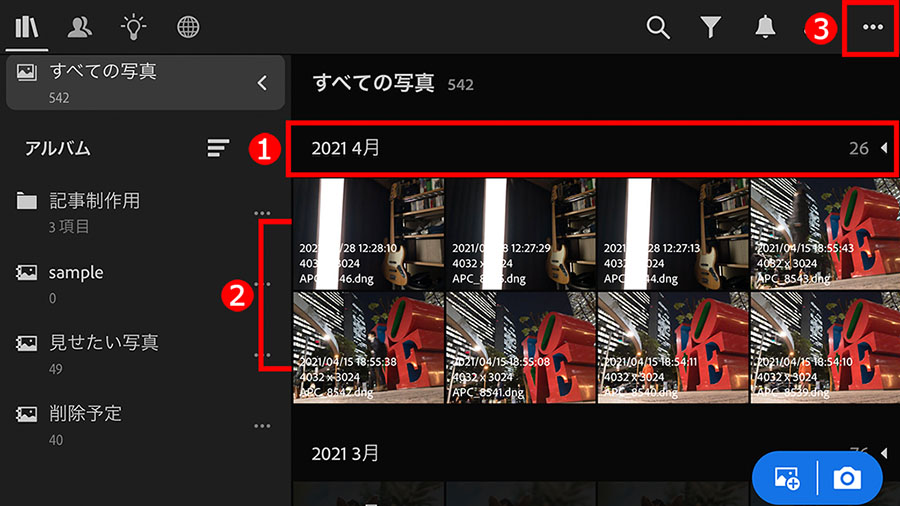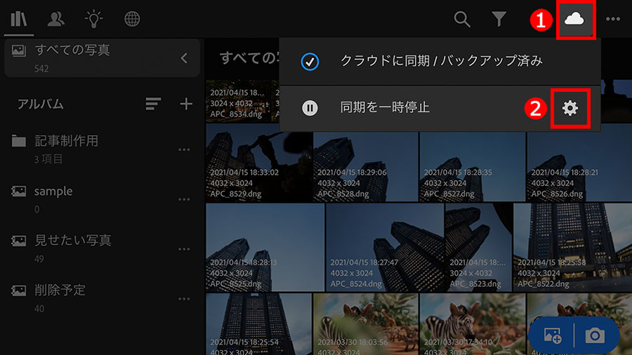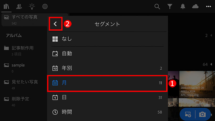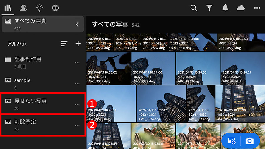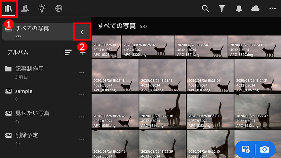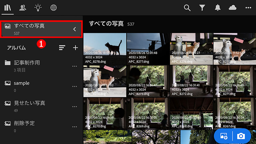 まずは、①「ライブラリ」ボタンをタップしてメニューを表示し、②「すべての写真」をタップして、Lightroom内のすべての写真を表示します。「アルバム」(後述参照)などを選んでも作業は同じです。