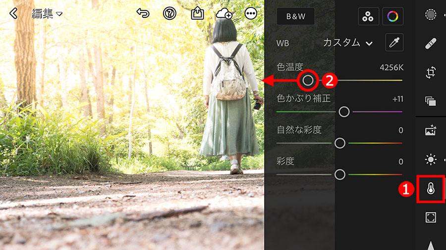 色を変える機能は、①「カラー」ボタンにある、②「色温度」スライダーです。左方向に移動すると青っぽい冷たい色にすることができます。