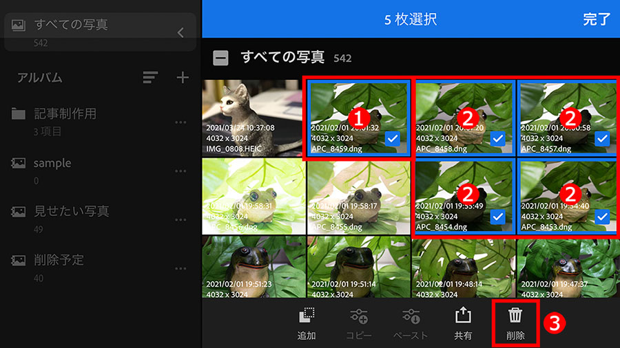 サムネール表示の状態で、①削除する写真を長押しして選択します。複数の写真を削除するときは、②削除する写真をタップして選択し、選び終わったら、③「削除」アイコンをタップして削除を実行します。